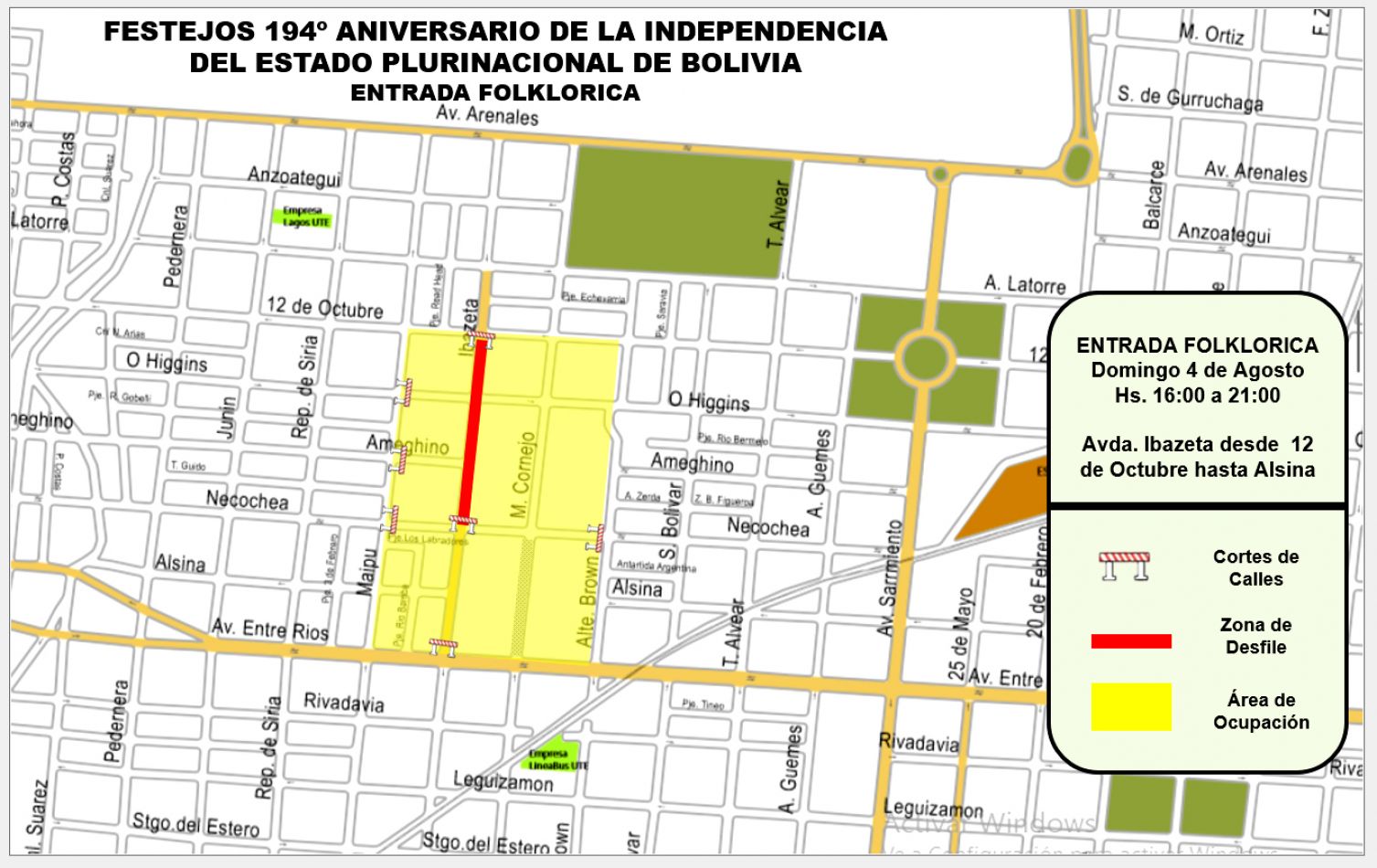 La Subsecretaría de Tránsito y Seguridad Vial, informó que se realizarán cortes de calle en distintos puntos de la ciudad, con motivo de los actos que llevará a cabo el Consulado de Bolivia por el 194º aniversario de la declaración de la independencia del mencionado país.
