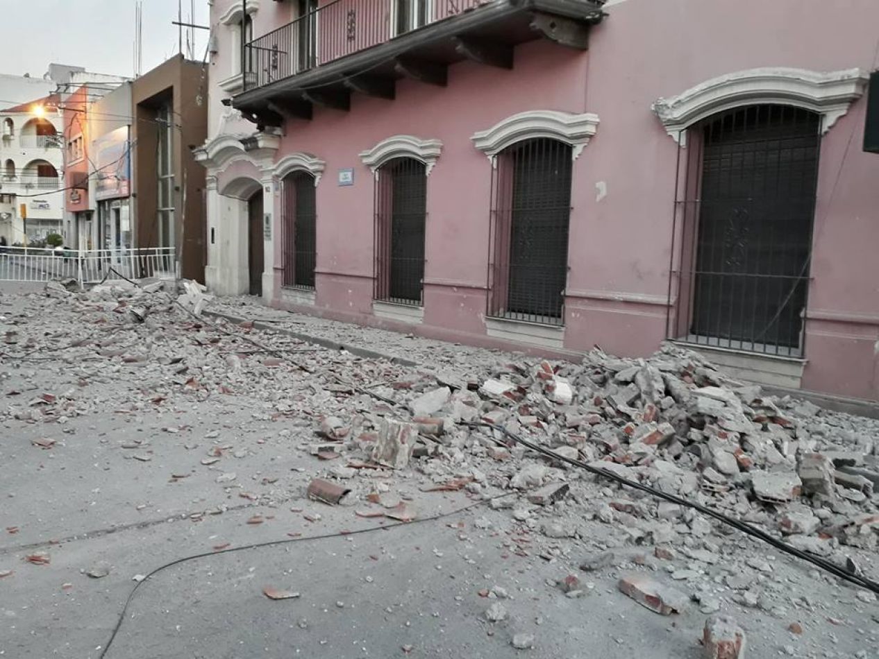 El viejo edificio, donde tiempo atrás funcionaba la Biblioteca Provincial, Ubicada en calle Caseros entre 25 de Mayo y Pellegrini, cedio en su parte alta arrastrando escombros de un alero y afectando cables de eneergía eléctrica.