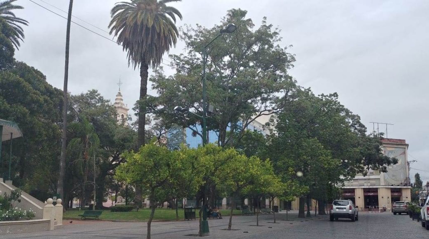 En el centro de la ciudad la calma es más acentuada que en los barrios, con muy pocos transeuentes alrededor de plaza 9 de julio.