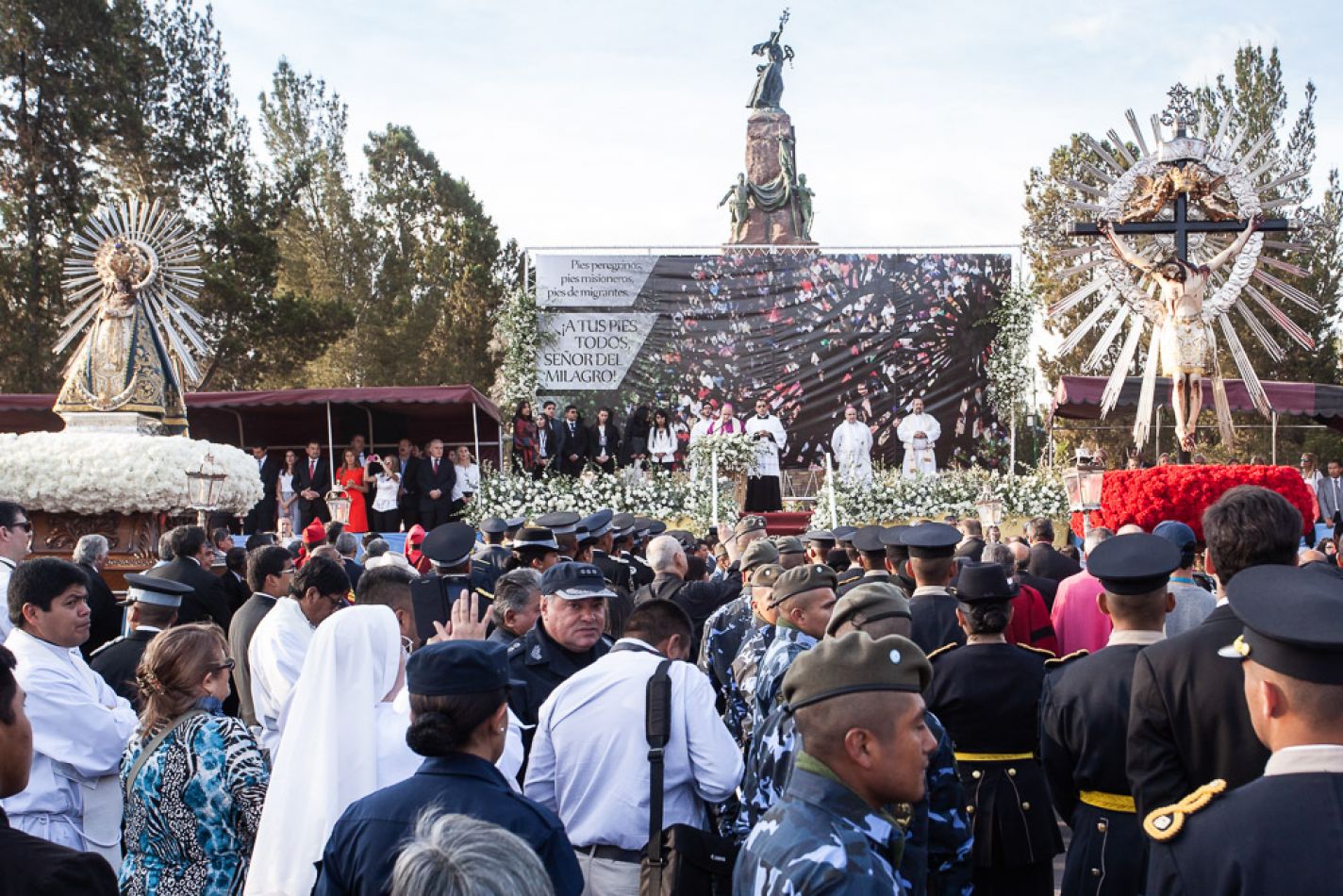 Luego la multitud reunida en la plaza 9 de Julio celebró la salida de la Virgen del Milagro, cuya imagen dispuesta sobre la corona de claveles blancos fue seguida por los fieles en la marcha hasta el monumento 20 de Febrero. A continuación, el Señor del Milagro, con la tradicional corona de claveles rojos a sus pies, siguió en procesión hasta el sitial dispuesto para la renovación del Pacto de Fidelidad que expresa cada año el pueblo de Salta.