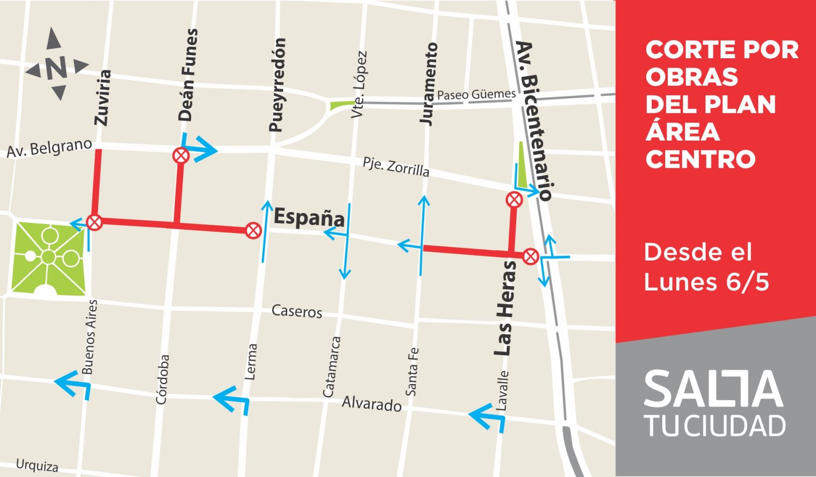 La Subsecretaría de Tránsito y Seguridad Vial confirmó que, por obras del área centro, a partir de esta semana permanecerá cortada al tránsito la calle España, desde Bicentenario de la Batalla de Salta hasta Juramento.