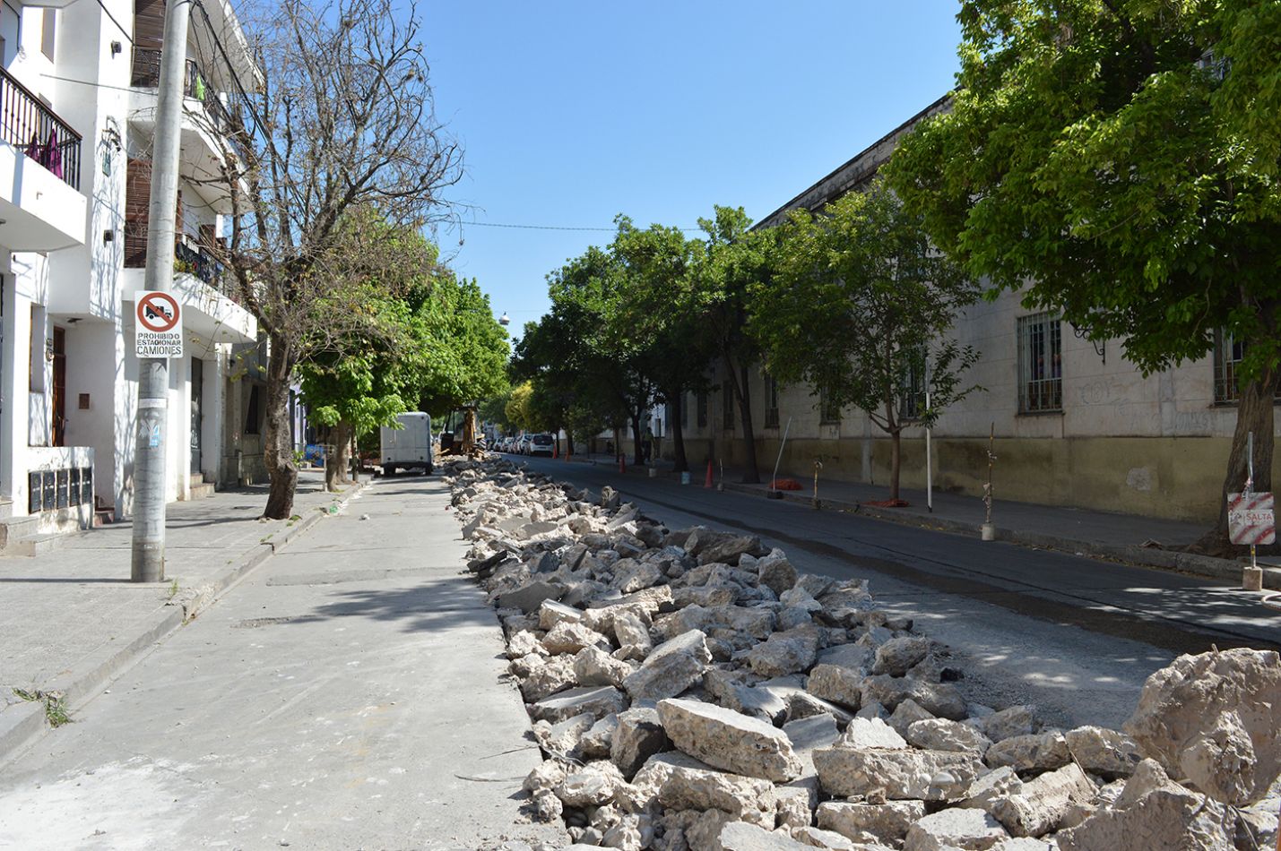 Con maquinaria pesada, las cuadrillas demolieron el viejo pavimento y retiraron escombros en un perímetro de cuarenta metros donde se constataron daños en los paneles de hormigón. En el proyecto de la obra se incluye el análisis y movimiento de suelo, colocación de nueva base granular, nivelación, compactación del terreno y acondicionamiento para el posterior hormigonado. Las tareas finalizarán con el tiempo de fraguado y sellado de juntas.
