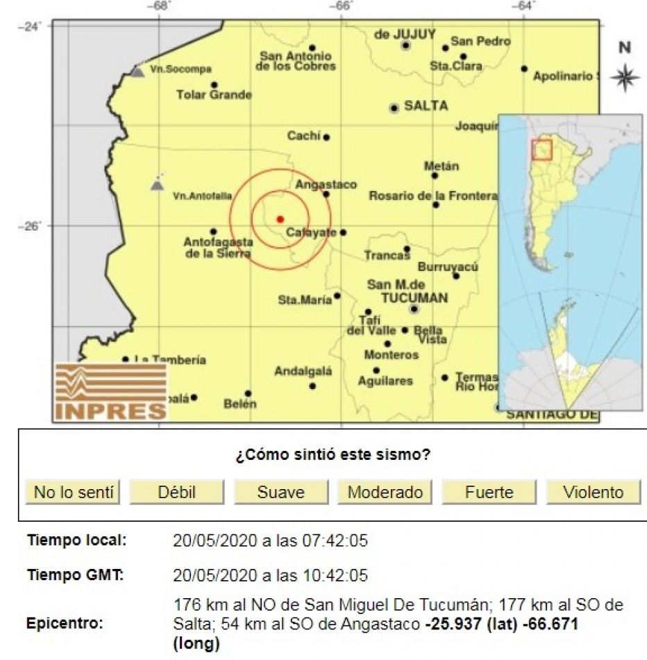 Según los registros del Instituto Nacional de Prevención Sísmica, el temblor se registró a las 07:42 hs. con epicentro en Cafayate, a 176 km al NO de San Miguel De Tucumán; 177 km al SO de Salta; 54 km al SO de Angastaco.