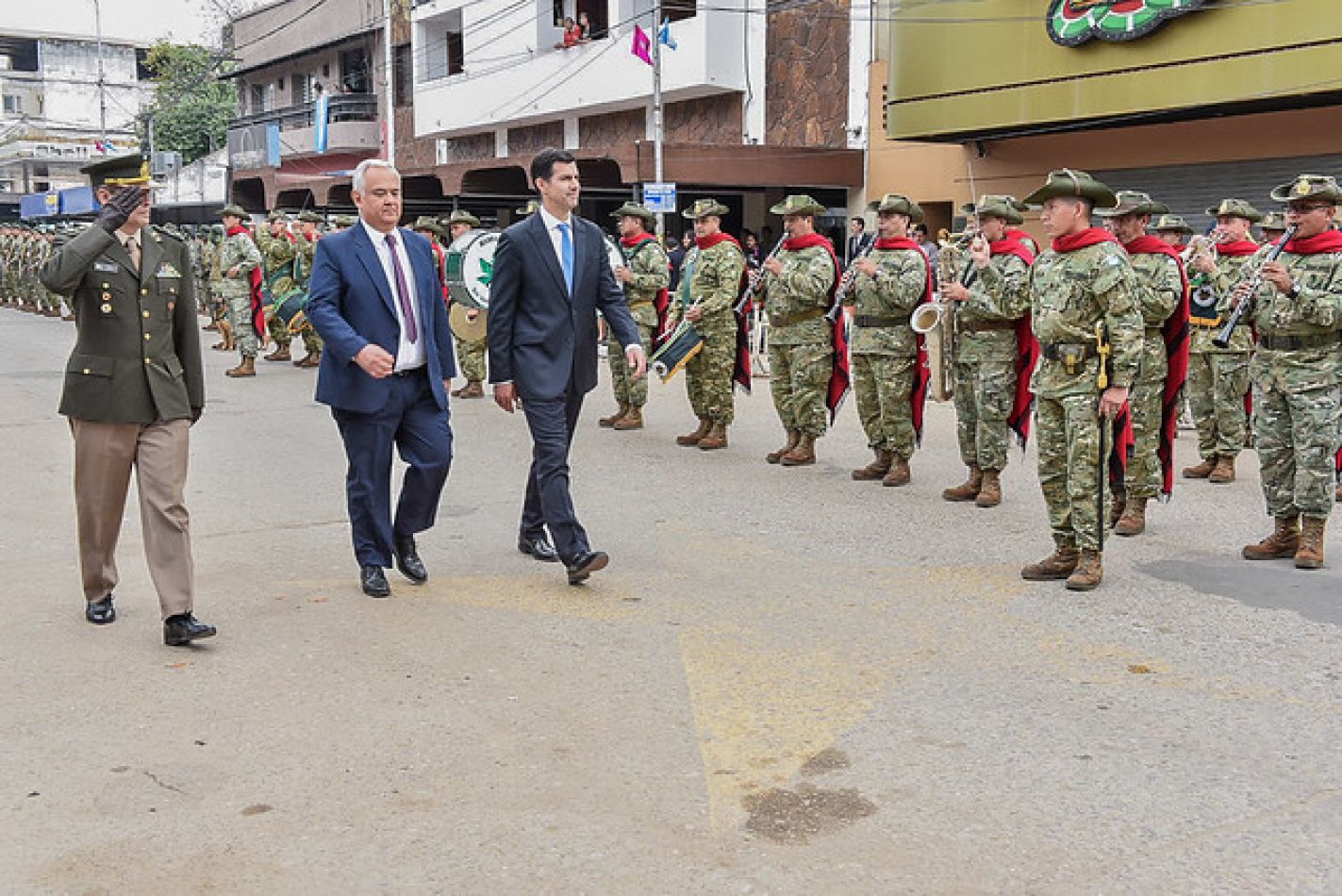 Posteriormente, Urtubey se trasladó al palco oficial ubicado en calle San Martín donde se realizó el tradicional desfile cívico militar con la participación de instituciones de seguridad, educativas, municipales, sociales y fortines gauchos.